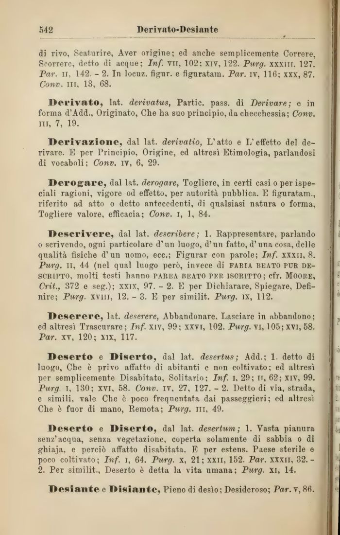 Deserto e Diserto, dal lat. desertus; Add.; 1. detto di luogo, Che è privo affatto di abitanti e non coltivato; ed altresì per semplicemente Disabitato, Solitario; Inf. i, 29; n, 62; xiv, 99. Purg. i, 130; xvi, 58. Conv. ìv, 27, 127. - 2. Detto di via, strada, e simili, vale Che è poco frequentata dai passeggieri; ed altresì Che è fuor di mano, Remota; Purg. ni, 49.
