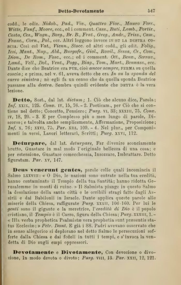 Deus veneruiit gentes, parole colle quali incomincia il Salmo lxxviii : « 0 Dio, le nazioni sono entrate nella tua eredità, hanno contaminato il Tempio della tua Santità; hanno ridotta Gerusalemme in monti di ruine. » Il Salmista piange in questo Salmo la desolazione della santa città e le orribili stragi fatte dagli As-sirii e dai Babilonii in Israele. Dante applica queste parole alle miserie della Chiesa, raffigurate Purg. xxxn, 106-160. Per lui le genti sono il gigante e la meretrice, V eredità di Dio è il popolo cristiano, il Tempio è il Carro, figura della Chiesa; Purg. xxxiii, 1.-« Illa verba prophetica Psalmistse vera propbetia sunt prsesentis status Ecclesia; » Petr. Dant. E già i SS. Padri avevano osservato che in senso allegorico si deplorano nel detto Salmo le persecuzioni sofferte dalla Chiesa e dai fedeli in tutti i tempi, e s'invoca la vendetta di Dio sugli empi oppressori.