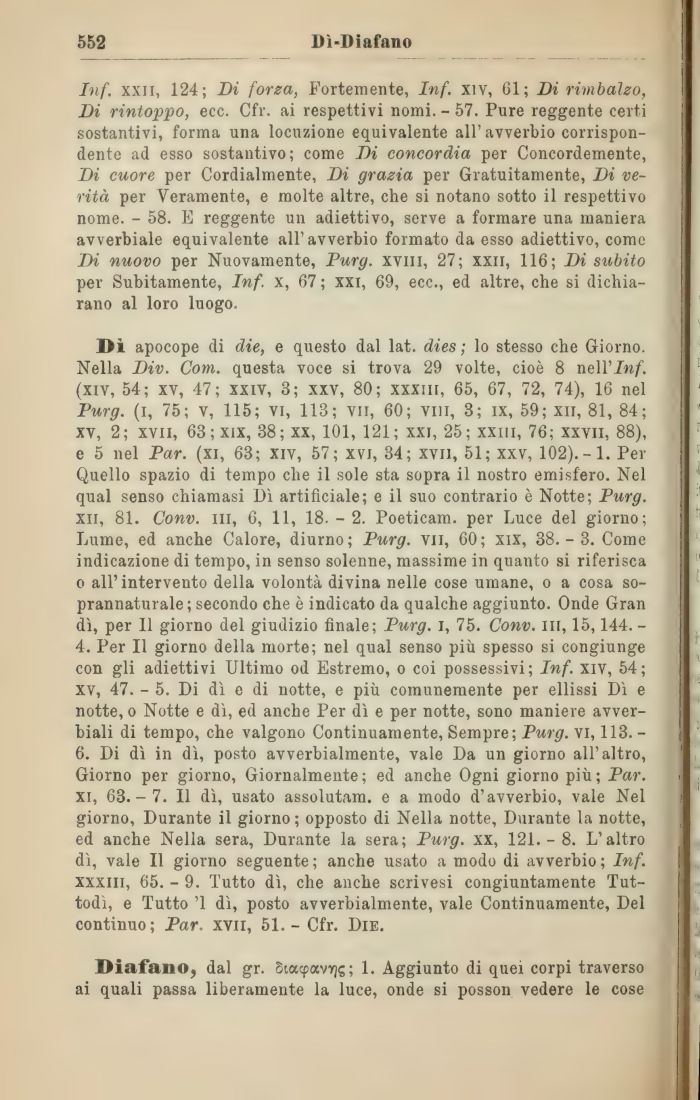 Dì apocope di die, e questo dal lat. dies ; lo stesso che Giorno. Nella Div. Coni, questa voce si trova 29 volte, cioè 8 neìVInf. (xiv, 54; xv, 47; xxiv, 3; xxv, 80; xxxiii, 65, 67, 72, 74), 16 nel Purg. (i, 75; v, 115; vi, 113; vii, 60; vili, 3; ix, 59; xii, 81, 84; xv, 2; xvii, 63; xix, 38; xx, 101, 121; xxi, 25; xxiii, 76; xxvii, 88), e 5 nel Par. (xi, 63; xiv, 57; xvi, 34; xvii, 51; xxv, 102).-1. Per Quello spazio di tempo che il sole sta sopra il nostro emisfero. Nel qual senso chiamasi Dì artificiale; e il suo contrario è Notte; Purg. xii, 81. Conv. ni, 6, 11, 18. - 2. Poeticam. per Luce del giorno; Lume, ed anche Calore, diurno; Purg. vii, 60; xix, 38.- 3. Come indicazione di tempo, in senso solenne, massime in quanto si riferisca o all'intervento della volontà divina nelle cose umane, o a cosa soprannaturale ; secondo che è indicato da qualche aggiunto. Onde Gran dì, per 11 giorno del giudizio finale; Purg. i, 75. Conv. in, 15,144. -4. Per II giorno della morte; nel qual senso più spesso si congiunge con gli adiettivi Ultimo od Estremo, o coi possessivi; Inf. xiv, 54; xv, 47. - 5. Di dì e di notte, e più comunemente per ellissi Dì e notte, o Notte e dì, ed anche Per dì e per notte, sono maniere avverbiali di tempo, che valgono Continuamente, Sempre; Purg. vi, 113. -6. Di dì in dì, posto avverbialmente, vale Da un giorno all'altro, Giorno per giorno, Giornalmente; ed anche Ogni giorno più; Par. xi, 63.-7. Il dì, usato assolutam. e a modo d'avverbio, vale Nel giorno, Durante il giorno; opposto di Nella notte, Durante la notte, ed anche Nella sera, Durante la sera; Purg. xx, 121.-8. L'altro dì, vale II giorno seguente ; anche usato a modo di avverbio ; Inf. xxxiii, 65. - 9. Tutto dì, che anche scrivesi congiuntamente Tuttodì, e Tutto '1 dì, posto avverbialmente, vale Continuamente, Del continuo; Par. xvii, 51.- Cfr. Die.
