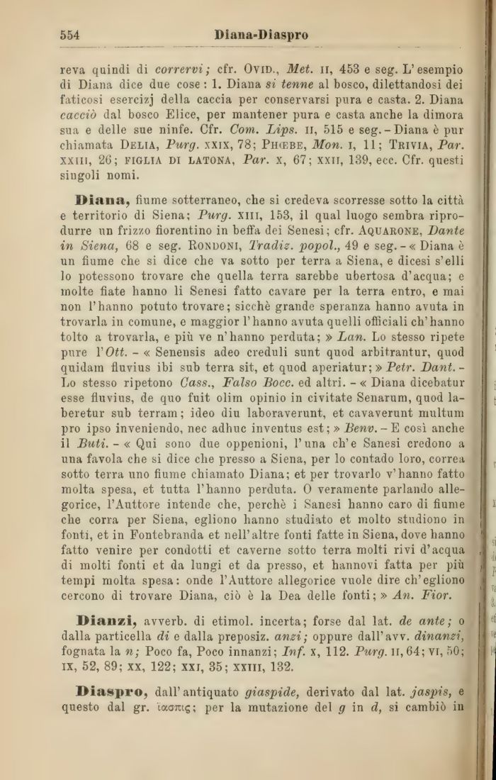 Diana, fiume sotterraneo, che si credeva scorresse sotto la città e territorio di Siena; Purg. xm, 153, il qual luogo sembra riprodurre un frizzo fiorentino in beffa dei Senesi; cfr. Aquarone, Dante in Siena, 68 e seg. Kondoni, Tradiz. popol., 49 e seg.-« Diana è un fiume che si dice che va sotto per terra a Siena, e dicesi s'elli