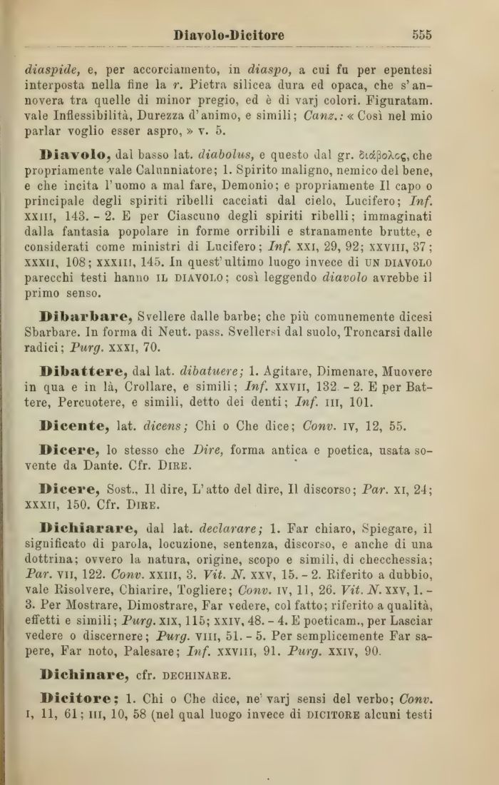 l>lavolo? dal basso lat. diabolus, e questo dal gr. StocPoXcg, che propriamente vale Calunniatore; 1. Spirito maligno, nemico del bene, e che incita l'uomo a mal fare, Demonio; e propriamente II capo o principale degli spiriti ribelli cacciati dal cielo, Lucifero; Inf. xxm, 143.-2. E per Ciascuno degli spiriti ribelli; immaginati dalla fantasia popolare in forme orribili e stranamente brutte, e considerati come ministri di Lucifero; Inf. xxi, 29, 92; xxviii, 37; xxxii, 108; xxxiii, 145. In quest'ultimo luogo invece di un diavolo parecchi testi hanno il diavolo; così leggendo diavolo avrebbe il primo senso.