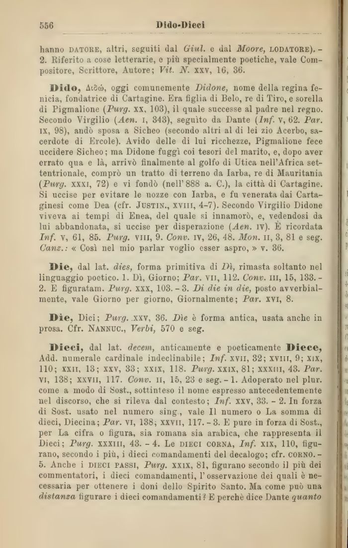 Dieci, dal lat. decem, anticamente e poeticamente Diece, Add. numerale cardinale indeclinabile; Inf. xvil, 32; xvlll, 9; xix, 110; xxii, 13; xxv, 33; xxix, 118. Purg. xxix, 81; xxxiii, 43. Par. vi, 138; xxvii, 117. Conv. n, 15, 23 e seg. -1. Adoperato nel plur. come a modo di Sost., sottinteso il nome espresso antecedentemente nel discorso, che si rileva dal contesto; Inf. xxv, 33. - 2. In forza di Sost. usato nel numero sing., vale II numero o La somma di dieci, Diecina; Par. vi, 138; xxvil, 117. - 3. E pure in forza di Sost., per La cifra o figura, sia romana sia arabica, che rappresenta il Dieci; Purg. xxxiii, 43. -4. Le dieci corna, Inf. xix, 110, figurano, secondo i più, i dieci comandamenti del decalogo; cfr. corno.-5. Anche i dieci passi, Purg. xxix, 81, figurano secondo il più dei commentatori, i dieci comandamenti, l'osservazione dei quali è necessaria per ottenere i doni dello Spirito Santo. Ma come può una distanza figurare i dieci comandamenti? E perchè dice Dante quanto