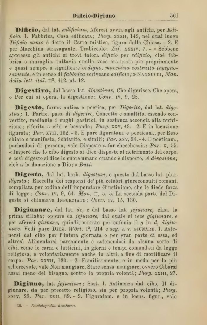 Digesto, dal lat. barb. digestum, e questo dal basso lat. plur. digesta; Raccolta dei responsi de'più celebri giureconsulti romani, compilata per ordine dell'imperatore Giustiniano, che le diede forza di legge ; Conv. ìv, 9, 64. Mon. n, 5, 5. La seconda parte del Digesto si chiamava Inforziato; Conv. ìv, 15, 130.