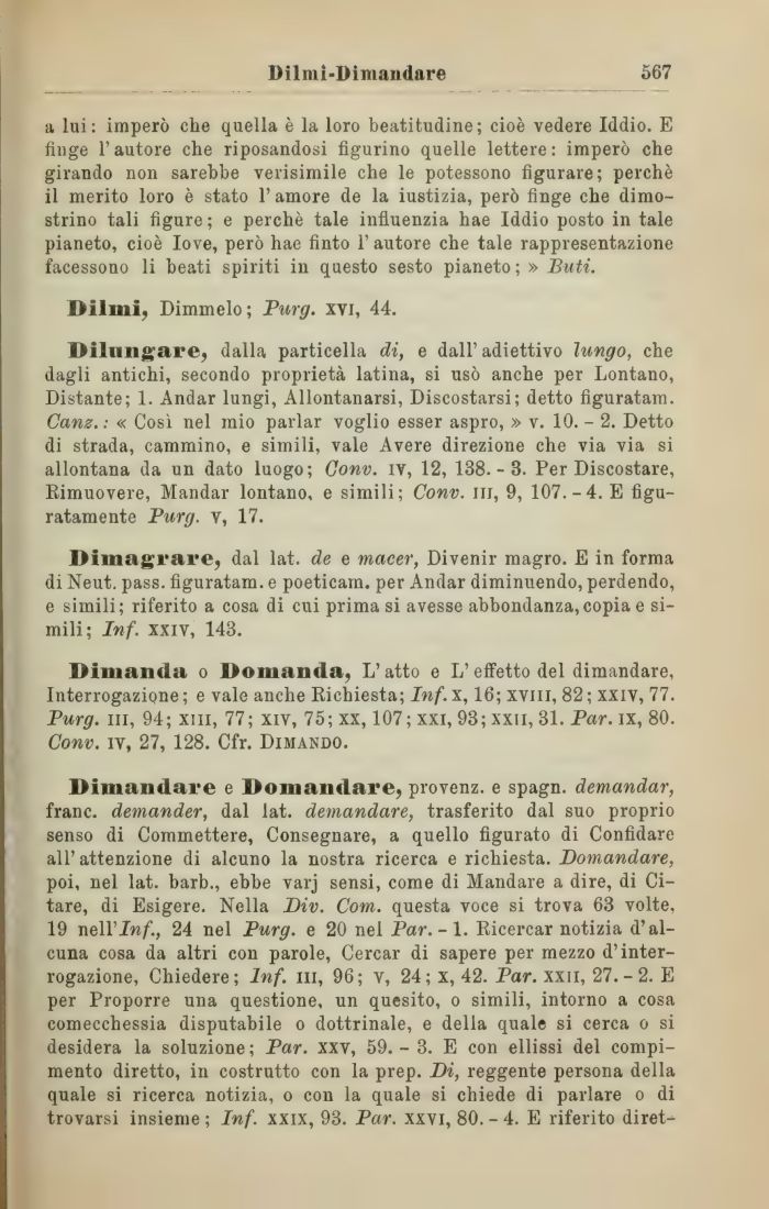 Dimanda o Domanda, L'atto e L'effetto del dimandare, Interrogazione ; e vale anche Richiesta; Inf. x, 16; xviil, 82 ; xxiv, 77. Purg. in, 94; xiii, 77; xiv, 75; xx, 107; xxi, 93; xxil, 31. Par. ix, 80. Conv. iv, 27, 128. Cfr. Disiando.