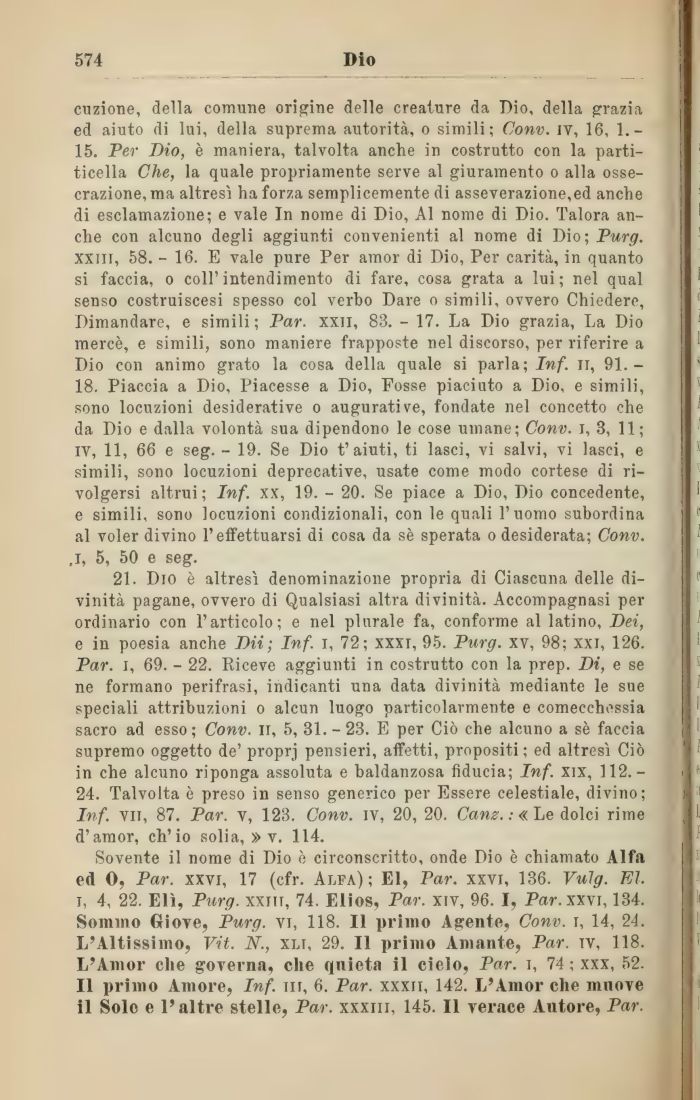 Sovente il nome di Dio è circonscritto, onde Dio è chiamato Alfa ed 0, Par. xxvi, 17 (cfr. Alfa); El, Par. xxvi, 136. Vuìg. FA. i, 4, 22. Eli, Purg. xxm, 74. Eiios, Par. xiv, 96. I, Par. xxvi, 134. Sommo Giove, Purg. vi, 118. Il primo Agente, Conv. i, 14, 24. L'Altissimo, Vit. N., Xlt, 29. Il primo Amante, Par. ìv, 118. L'Amor che governa, che quieta il cielo, Par. i, 74 ; xxx, 52. Il primo Amore, Inf. in, 6. Par. xxxii, 142. L'Amor che muove il Sole e l'altre stelle, Par. xxxiii, 145. Il verace Autore, Par.