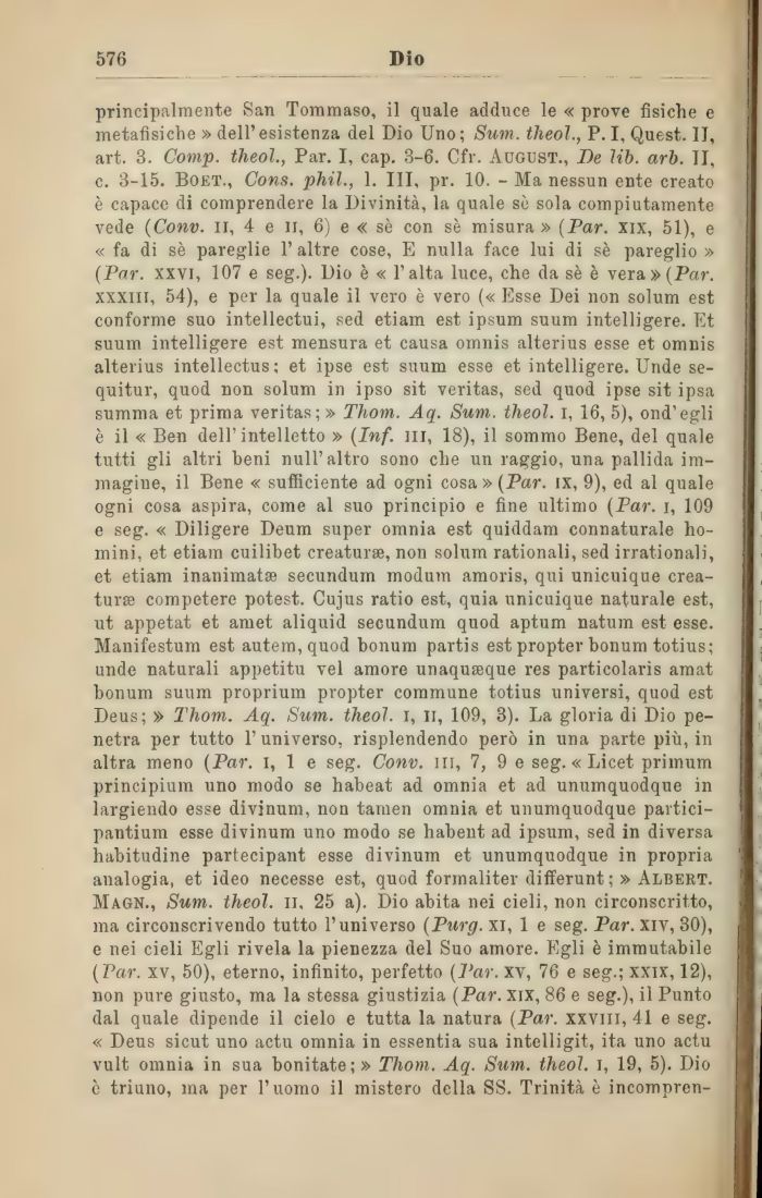 principalmente San Tommaso, il quale adduce le « prove fģsiche e metafisiche » dell'esistenza del Dio Uno; Sum. tlieol., P.I, Quest. II, art. 3. Comp. theol., Par. I, cap. 3-6. Cfr. ąugust., De lib. arb. TI, c. 3-15. Boet., Cons. phil., 1. Ili, pr. 10. - Ma nessun ente creato č capace di comprendere la Divinitą, la quale sč sola compiutamente vede (Conv. u, 4 e li, 6) e « sč con sč misura » (Par. xix, 51), e « fa di sč pareglie 1' altre cose, E nulla face lui di sč pareglio » (Par. xxvi, 107 e seg.). Dio č « l'alta luce, che da sč č vera » (Par. xxxiii, 54), e per la quale il vero č vero (« Esse Dei non solum est conforme suo intellectui, sed etiam est ipsum suum intelligere. Et suum intelligere est mensura et causa omnis alterius esse et omnis alterius intellectus; et ipse est suum esse et intelligere. Unde se-quitur, quod non solum in ipso sit veritas, sed quod ipse sit ipsa summa et prima veritas; » Thom. Aq. Sum. theol. I, 16, 5), ond'egli č il « Ben dell'intelletto » (Inf. ni, 18), il sommo Bene, del quale tutti gli altri beni nuli'altro sono che un raggio, una pallida immagine, il Bene « sufficiente ad ogni cosa » (Par. ix, 9), ed al quale ogni cosa aspira, come al suo principio e fine ultimo (Par. i, 109 e seg. « Diligere Deum super omnia est quiddam connaturale ho-mini, et etiam cuilibet creaturse, non solum rationali, sed irrationali, et etiam inanimatse secundum modum amoris, qui unicuique creatura; competere potest. Cujus ratio est, quia unicuique naturale est, ut appetat et amet aliquid secundum quod aptum natum est esse. Manifestum est autem,quod bonum partis est propter bonum totius; unde naturali appetitu vel amore unaquaeque res particolarģs amat bonum suum proprium propter commune totius universi, quod est Deus; » Thom. Aq. Sum. theol. i, n, 109, 3). La gloria di Dio penetra per tutto l'universo, risplendendo perņ in una parte pił, in altra meno (Par. i, 1 e seg. Conv. in, 1, 9 e seg. « Licet primum principium uno modo se habeat ad omnia et ad unumquodque in largiendo esse divinum, non tamen omnia et unumquodque partici-pantium esse divinum uno modo se habent ad ipsum, sed in diversa habitudine partecipant esse divinum et unumquodque in propria analogia, et ideo necesse est, quod formaliter differunt; » Albert. Magn., Sum. theol. il, 25 a). Dio abita nei cieli, non circonscritto, ma circonscrivendo tutto l'universo (Purg. xi, 1 e seg. Par. xiv, 30), e nei cieli Egli rivela la pienezza del Suo amore. Egli č immutabile (Par. xv, 50), eterno, infinito, perfetto (Par. xv, 76 e seg.; xxix, 12), non pure giusto, ma la stessa giustizia (Par. xix, 86 e seg.), il Punto dal quale dipende il cielo e tutta la natura (Par. xxviii, 41 e seg. « Deus sicut uno actu omnia in essentia sua intelligit, ita uno actu vult omnia in sua bonitate; » Thom. Aq. Sum. theol. i, 19, 5). Dio č triuno, ma per l'uomo il mistero della SS. Trinitą č incompren-