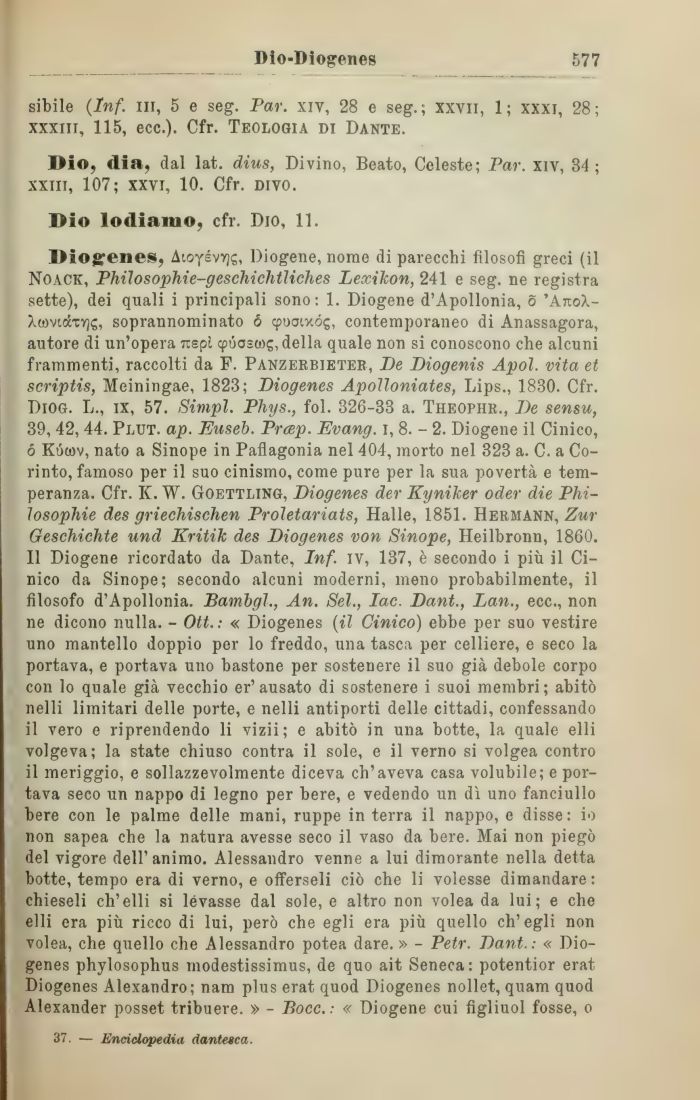 DiOffenes, AtoyévYjs, Diogene, nome di parecchi filosofi greci (il Noack, Philosophie-geschichtliches Leccikon, 241 e seg. ne registra sette), dei quali i principali sono: 1. Diogene d'Apollonia, 5 'ArcoX-Xu)v'.ccty]s, soprannominato ó cpoaocóg, contemporaneo di Anassagora, autore di un'opera Tcspi cpóasrog, della quale non si conoscono che alcuni frammenti, raccolti da F. Panzerbieter, De Diogenis Apoì. vita et scriptis, Meiningae, 1823; Diogenes Apolloniates, Lips., 1830. Cfr. Diog. L., ix, 57. Simpl. Phys., fol. 326-33 a. Theophr., De sensu, 39, 42, 44. Plut. ap. Euseb. Prcep. Evang. i, 8. - 2. Diogene il Cinico, <5 Kówv, nato a Sinope in Pafiagonia nel 404, morto nel 323 a. C. a Corinto, famoso per il suo cinismo, come pure per la sua povertà e temperanza. Cfr. K. W. Goettling, Diogenes der KyniJcer oder die Phi-losophie des griechisehen Proìetariats, Halle, 1851. Hermann, Zur Geschichte und Kritik des Diogenes von Sinope, Heilbronn, 1860. Il Diogene ricordato da Dante, Inf. iv, 137, è secondo i più il Cinico da Sinope; secondo alcuni moderni, meno probabilmente, il filosofo d'Apollonia. Bambgl., An. Sei., Iac. Dant., Dan., ecc., non ne dicono nulla. - Ott. : « Diogenes (il Cinico) ebbe per suo vestire uno mantello doppio per lo freddo, una tasca per celliere, e seco la portava, e portava uno bastone per sostenere il suo già debole corpo con lo quale già vecchio er'ausato di sostenere i suoi membri; abitò nelli limitari delle porte, e nelli antiporti delle cittadi, confessando il vero e riprendendo li vizii; e abitò in una botte, la quale elli volgeva; la state chiuso contra il sole, e il verno si volgea contro il meriggio, e sollazzevolmente diceva ch'aveva casa volubile; e portava seco un nappo di legno per bere, e vedendo un dì uno fanciullo bere con le palme delle mani, ruppe in terra il nappo, e disse: io non sapea che la natura avesse seco il vaso da bere. Mai non piegò del vigore dell'animo. Alessandro venne a lui dimorante nella detta botte, tempo era di verno, e offerseli ciò che li volesse dimandare : chieseli eh'elli si levasse dal sole, e altro non volea da lui; e che elli era più ricco di lui, però che egli era più quello ch'egli non volea, che quello che Alessandro potea dare. » - Petr. Dant.: « Diogenes phylosophus modestissimus, de quo ait Seneca: potentior erat Diogenes Alexandro; nam plus erat quod Diogenes nollet, quam quod Alexander posset tribuere. » - Bocc. : « Diogene cui figliuol fosse, o