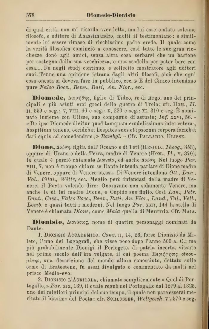 1. Dionisio Accademico, Conv. ii, 14, 26, forse Dionisio da Mi-leto, l'uno dei Logografi, che visse poco dopo l'anno 500 a. C.; ma più probabilmente Dionigi il Periegete, di patria incerta, vissuto nel primo secolo dell'èra volgare, il cui poema nepiYjyyjaic; oExou-jjivvjs, una descrizione del mondo allora conosciuto, dettato sulle orme di Eratostene, fu assai divulgato e commentato da molti nel prisco Medio-evo.