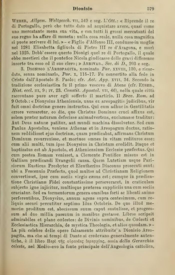 Weber, Allgem. Wéltgesch. vn, 549 e seg. L'Ott.: « Riprende il re di Portogallo, però che tutto dato ad acquistare avere, quasi come uno mercatante mena sua vita, e con tutti li grossi mercatanti del suo regno ha affare di moneta: nulla cosa reale, nulla cosa magnifica si puote scrivere di lui. » - « Figlio d'Alfonso III, condusse-in moglie nel 1281 Elisabetta figliuola di Pietro III re d'Aragona, e morì nel 1325. Debb'essere questo Dionigi quel re di Portogallo, il quale ebbe mestieri che il pontefice Nicola giudicasse delle gravi differenze insorte tra esso ed il suo clero; » Arrivab., Sec. di D., 203 e seg.