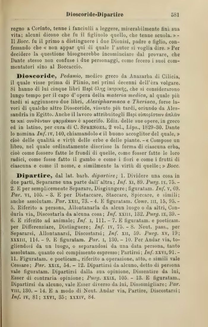 Dioscoride, Pedanio, medico greco da Anazarba di Cilicia, il quale visse prima di Plinio, nei primi decenni dell'èra volgare. Si hanno di lui cinque libri Ilepi 6Xt;s Eaxpixrjg, che si considerarono lungo tempo per il capo d'opera della materia medica, al quale più tardi si aggiunsero due libri, Alexipharmaca e Theriaca, forse lavori di qualche altro Dioscoride, vissuto più tardi, oriundo da Alessandria in Egitto. Anche il lavoro attribuitogli llepì sùTtopia-ctov àrcXwv te xaì auvfrévTctìv cpapjjiàxtóv è apocrifo. Ediz. delle sue opere, in greco ed in latino, per cura di C. Sprengel, 2 voi., Lips., 1829-30. Dante lo nomina Inf. iv, 140, chiamandolo « il buono accoglitor del quale, » cioè delle qualità e virtù delle erbe e delle piante. -« Compose un libro, nel quale ordinatamente discrisse la forma di ciascuna erba, cioè come fossero fatte le frondi di quelle, come fosser fatte le loro radici, come fosse fatto il gambo e come i fiori e come i frutti di ciascuna e come il nome, e similmente la virtù di quelle ;» Bocc.