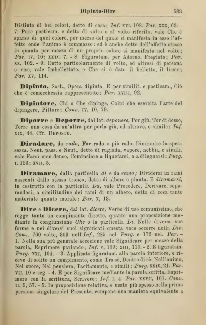 Dire e Dicere, dal lat. dicere, Verbo di uso comunissimo, che regge tanto un compimento diretto, quanto una proposizione mediante la congiunzione Che o la particella Di. Nelle diverse sue forme e nei diversi suoi significati questa voce occorre nella Div. Com., 760 volte, 303 neėYInf., 285 nel Purg. e 172 nel. Par. -1. Nella sua pių generale accezione vale Significare per mezzo della parola, Esprimere parlando; Inf. v, 139; xlll, 110.-2. E figuratam. Purg. xxi, 104. - 3. Applicato figuratam. alla parola interiore, e riceve di solito un compimento, come Trasč, Dentro di sč, Nell'animo, Nel cuore, Nel pensiero, Tacitamente, e simili; Purg. xxix, 21. Par. Vii, 10 e seg.- 4. E per Significare mediante la parola scritta, Esprimere con la scrittura, Scrivere; Inf. i, 4. Par. xxvii, 101. Conv. il, 9, 57. - 5. In proposizione relativa, e usato pių spesso nella prima persona singolare del Presente, compone una maniera equivalente a