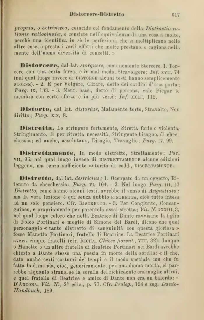 Distretto, dal lat. destrictus; 1. Occupato da un oggetto, Ritenuto da checchessia; Purg. vi, 104. - 2. Nel luogo Purg. ili, 12 Distretto, come hanno alcuni testi, avrebbe il senso di Angustiato ; ma la vera lezione è qui senza dubbio ristretta, cioè tutto intesa ad un solo pensiero. Cfr. Ristretto. - 3. Psr Congiunto, Consanguineo, e propriamente per parentela assai stretta; Vit. N. xxxm, 3, nel qual luogo coloro che nella Beatrice di Dante ravvisano la figlia di Folco Portinari e moglie di Simone dei Bardi, dicono che quel personaggio « tanto distretto di sanguinità con questa gloriosa » fosse Manetto Portinari, fratello di Beatrice. La Beatrice Portinari aveva cinque fratelli (cfr. Riciia, Chiese fiorent., vili, 32); dunque o Manetto o un altro fratello di Beatrice Portinari nei Bardi avrebbe chiesto a Dante stesso una poesia in morte della sorella: « il che, dato anche certi costumi de' tempi e il modo speciale con che fu fatta la dimanda, cioè, genericamente, per una donna morta, ci parrebbe alquanto strano, se la sorella del richiedente era moglie altrui, e quel fratello di Beatrice e amico di Dante non era un balordo; » D'Ancona, Vit. N., 2a ediz., p. 77. Cfr. Proleg., 194 e seg. Dante-Handbuch, 189.