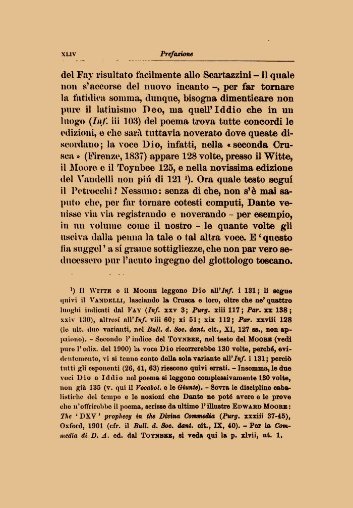 ') 11 Witte o il Moore leggono Dio ali 'Inf. i 131; li segue «Ulivi il Vandelli, lasciando la Crusca e loro, oltre che ne' quattro luoghi indicati dal Fay (Inf. xxv 3; Purg. xiii 117; Par. xx 138; xxiv 130), altresì' ali 'Inf. viii 60; xi 51; xix 112; Par. xxviii 128 (lo ult. duo varianti, nel Bull. d. Soc. dant. cit., XI, 127 ss., non appaiono). - Secondo l'indico del Toynbee, nel testo del Moore (vedi puro l'odisi, del 1900) la voce Dio ricorrerebbe 130 volte, perché, evidentemente, vi si tenne conto della sola variante all'in/, i 131; perciò tutti gli esponenti (26, 41, 63) riescono quivi errati. - Insomma, le due voci Dio e Iddio nel poema si leggono complessivamente 130 volte, non già 135 (v. qui il Vocàbol. e le Giunte). - Sovra le discipline cabalistiche del tempo e le nozioni che Dante ne potè avere e le prove che n'oll'rirebbo il poema, scrisse da ultimo l'illustre Edward Moore : The ' DXV ' propheaj in the Divina Commedia (Purg. xxxiii 37-45), Oxford, 1901 (cfr. il Bull. d. Soc. dant. cit., IX, 40). - Per la Commedia di D. A. ed. dal Toynbee, si veda qui la p. xlvii, nt. 1.