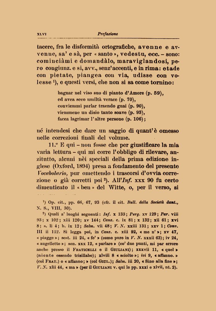 11. E qui - non fosse che per giustificare la mia varia lettura - qui mi corre l'obbligo di rilevare, anzitutto, alcuni liči speciali della prima edizione inglese (Oxford, 189-1) presa a fondamento del presente Vocabolario, pur omettendo i trascorsi d'ovvia correzione o gią corretti poi2). AWInf. xxx 90 fu certo dimenticato il « ben » del Witte, o, per il verso, si