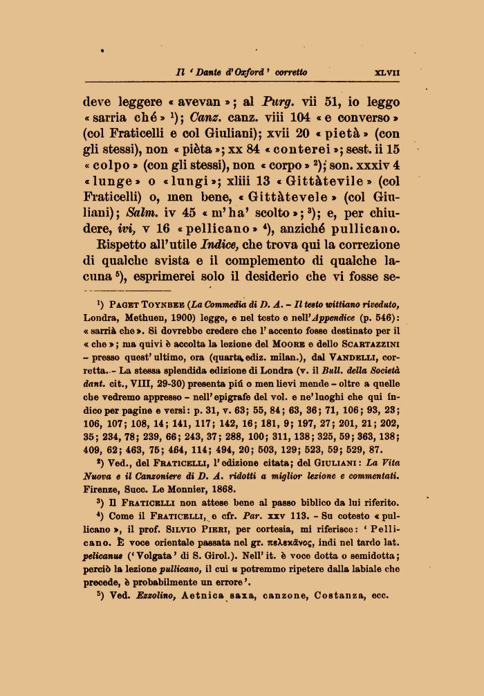 (leve leggere « avevan » ; al Purg. -sii 51, io leggo «sarria ché » *); Cam. canz. viii 104 «e converso» (col Fraticelli e col Giuliani); xvii 20 «pietà» (con gli stessi), non « pièta »; xx 84 « conterei »; sest. ii 15 « colpo » (con gli stessi), non « corpo » 2); son. xxxiv 4 «lunge» o «lungi»; xliii 13 « Gittàtevile » (col Fraticelli) o, men bene, « Gittàtevele » (col Giuliani); Salm. iv 45 «m'ha' scolto»;3); e, per chiudere, ivi, v 16 «pellicano» 4), anziché pullicano.