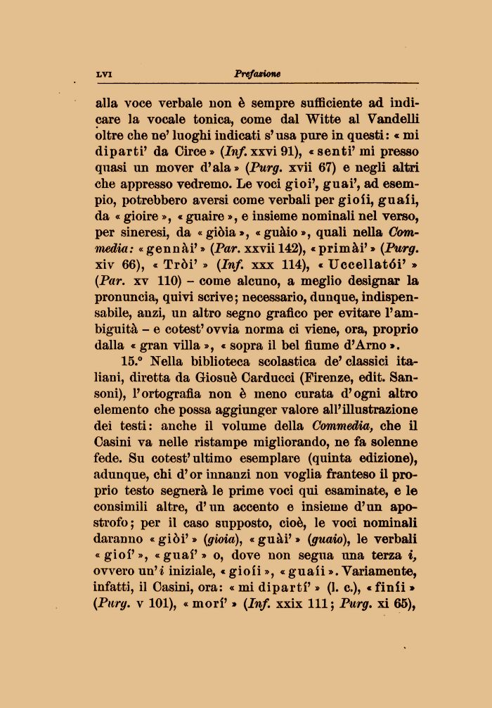 15.° Nella biblioteca scolastica de' classici italiani, diretta da Giosuè Carducci (Firenze, edit. Sansoni), l'ortografia non è meno curata d'ogni altro elemento che possa aggiunger valore all'illustrazione dei testi: anche il volume della Commedia, che il Casini va nelle ristampe migliorando, ne fa solenne fede. Su cotest'ultimo esemplare (quinta edizione), adunque, chi d'or innanzi non voglia franteso il proprio testo segnerà le prime voci qui esaminate, e le consimili altre, d'un accento e insieme d'un apostrofo; per il caso supposto, cioè, le voci nominali daranno « gịi' » (gioia), « guài' » (guaio), le verbali «gió'», «guá'» o, dove non segua una terza i, ovvero un'i iniziale, « gioii », « guái ». Variamente, infatti, il Casini, ora: « mi dipart́' » (1. c.), « finii » (Purg. v 101), « moŕ' » (Inf. xxix 111 ; Purg. xi 65),