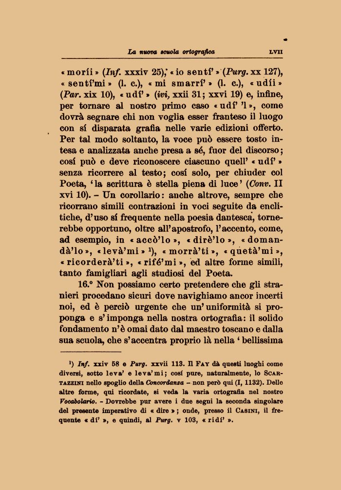 ') Inf. xxiv 58 e Purg. xxvii 113. Il Fay dà questi luoghi come diversi, sotto leva' e lev a'mi; cosi pure, naturalmente, lo Scartazzini nello spoglio della Concordanza - non però qui (I, 1132). Delle altre forme, qui ricordate, si veda la varia ortografia nel nostro Vocabolario. - Dovrebbe pur avere i due segni la seconda singolare del presente imperativo di « dire » ; onde, presso il Casini, il frequente « di' », e quindi, al Purg. v 103, « ridi' ».