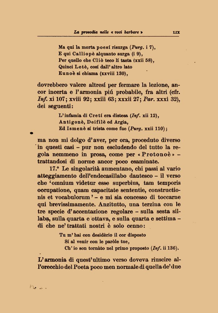 17.° Le singolarità aumentano, chi passi al vario atteggiamento dell'endecasillabo dantesco - il verso che 'omnium videtur esse superbius, tam temporis occupatione, quam capacitate sententie, constructio-nis et vocabulorum ' - e mi sia concesso di toccarne qui brevissimamente. Anzitutto, una terzina con le tre specie d'accentazione regolare - sulla sesta sillaba, sulla quarta e ottava, e sulla quarta e settima -di che ne'trattati nostri è solo cenno: