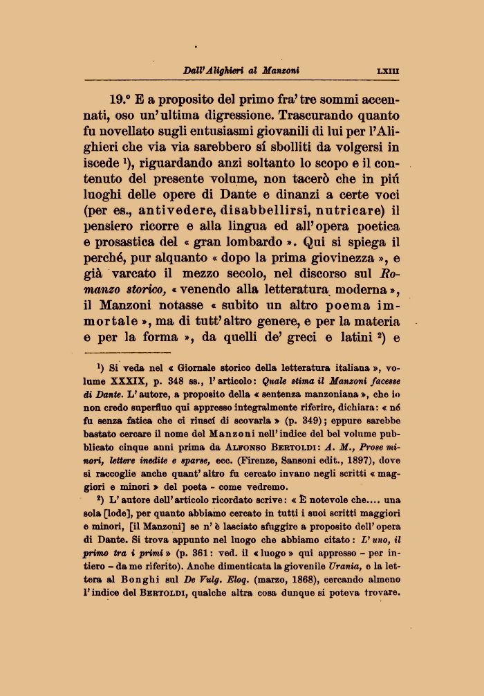 19.° E a proposito del primo fra' tre sommi accennati, oso un'ultima digressione. Trascurando quanto fu novellato sugli entusiasmi giovanili di lui per l'Alighieri che via via sarebbero si sbolliti da volgersi in iscede riguardando anzi soltanto lo scopo e il contenuto del presente volume, non tacerò che in piti luoghi delle opere di Dante e dinanzi a certe voci (per es., antivedere, disabbellirsi, nutricare) il pensiero ricorre e alla lingua ed all'opera poetica e prosastica del « gran lombardo ». Qui si spiega il perché, pur alquanto « dopo la prima giovinezza », e già varcato il mezzo secolo, nel discorso sul Romanzo storico, « venendo alla letteratura moderna », il Manzoni notasse « subito un altro poema immortale », ma di tutt'altro genere, e per la materia e per la forma », da quelli de' greci e latini 2) e