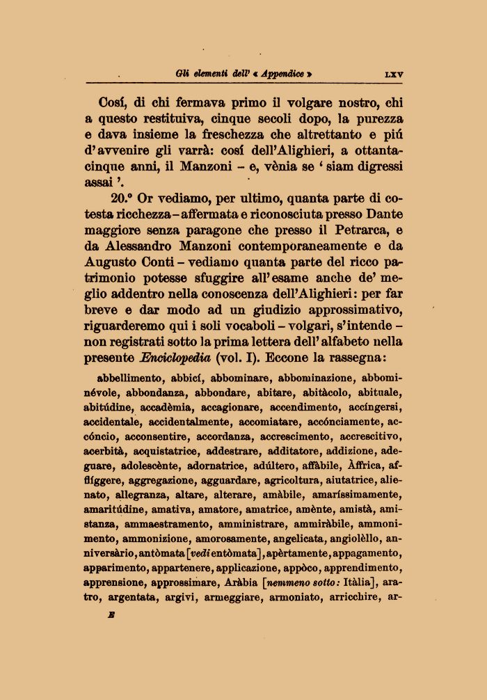 20.° Or vediamo, per ultimo, quanta parte di co-testa ricchezza-affermata e riconosciuta presso Dante maggiore senza paragone che presso il Petrarca, e da Alessandro Manzoni contemporaneamente e da Augusto Conti - vediamo quanta parte del ricco patrimonio potesse sfuggire all'esame anche de' meglio addentro nella conoscenza dell'Alighieri: per far breve e dar modo ad un giudizio approssimativo, riguarderemo qui i soli vocaboli - volgari, s'intende -non registrati sotto la prima lettera dell' alfabeto nella presente JErwklopedia (voi. I). Eccone la rassegna: