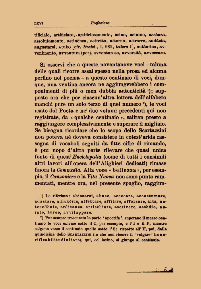 Si osservi che a queste novantanove voci - taluna delle quali ricorre assai spesso nella prosa ed alcuna perfino nel poema - a questo centinaio di voci, dunque, una ventina ancora ne aggiungerebbero i componimenti di più o men dubbia autenticità ; supposto ora che per ciascun'altra lettera dell'alfabeto manchi pure un solo terzo di quel numero 2), le voci usate dal Poeta e ne' due volumi precedenti qui non registrate, da « qualche centinaio », saliran presto a raggiungere complessivamente e superare il migliaio. Se bisogna ricordare che lo scopo dello Scartazzini non poteva né doveva consistere in cotest' arida rassegna di vocaboli seguiti da fitte cifre di rimando, è pur uopo d'altra parte rilevare che quasi unica fonte di quest'Enciclopedia (come di tutti i consimili altri lavori all'opera dell'Alighieri dedicati) rimase finora la Commedia. Alla voce « bellezza », per esempio, il Canzoniere e la Vita Nuova non sono punto rammentati, mentre ora, nel presente spoglio, raggiun-