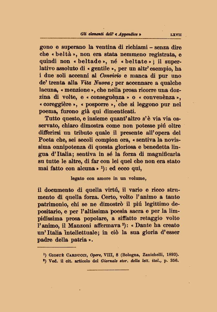 Tutto questo, e insieme quant' altro s'è via via osservato, chiaro dimostra come non potesse più oltre differirsi un tributo quale il presente all'opera del Poeta che, sei secoli compion ora, « sentiva la novissima onnipotenza di questa gloriosa e benedetta lingua d'Italia; sentiva in sé la forza di magnificarla su tutte le altre, di far con lei quel che non era stato mai fatto con alcuna » : ed ecco qui,