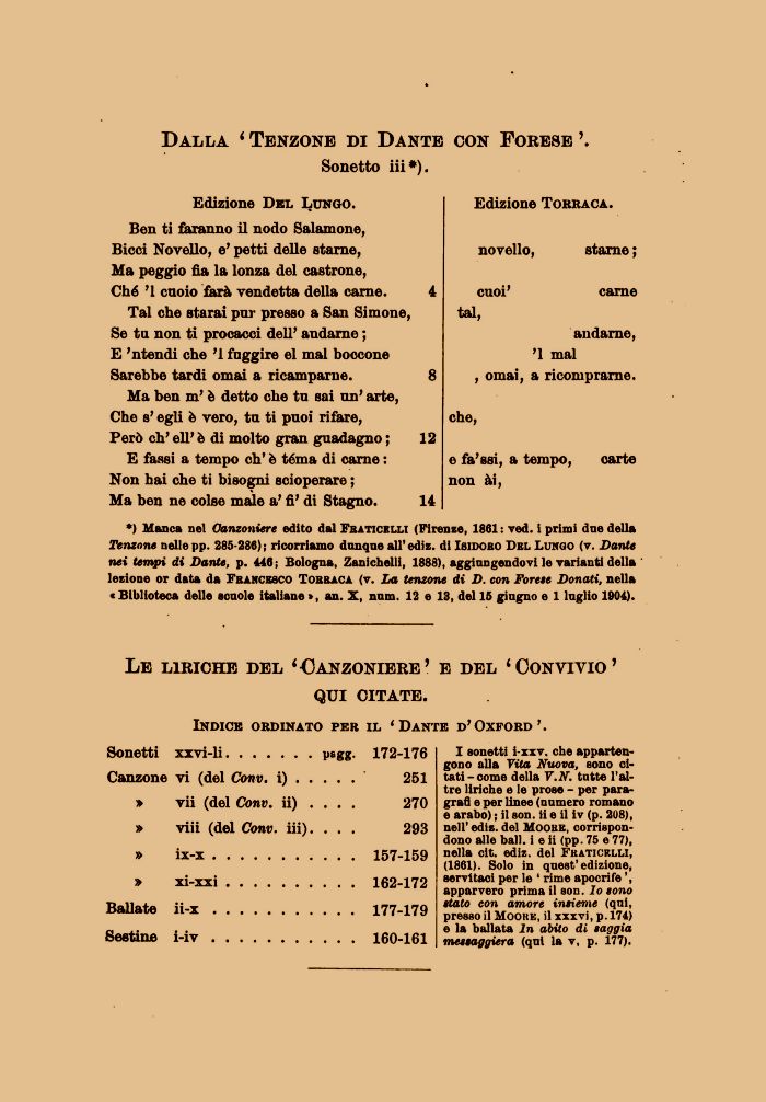 *) Manca nel Canzoniere edito dal Fraticelli (Firenze, 1861: ved. i primi dne della Tenzone nelle pp. 285-286) ; ricorriamo dnnqne all' ediz. di Isidoro Del Lungo (v. Dante nei tempi di Dante, p. 446; Bologna, Zanichelli, 1888), aggiungendovi le varianti della lezione or data da Francesco Torraca (v. La tenzone di D. con Forese Donati, nella < Biblioteca delle scuole italiane », an. X, nnm. 12 e 13, del 16 gingno e 1 luglio 1904).