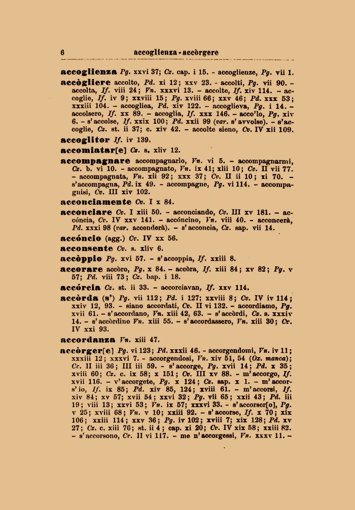 xviii 60; Cz. c. ix 58; x 151; Cv. Ili xv 88. - m'accorgo, If. xvii 116. - v'accorgete, Pg. x 124; Cz. sap. x 1. - m'accor-s'io, If. ix 85; Pd. xiv 85, 124; xviii 61. - m'accorsi, If. xiv 84; xv 57; xvii 54; xxvi 32; Pg. vii 65; xxii 43; Pd. iii 19; viii 13; xxvi 53; Vn. ix 57; xxxvi 33. - s'accorsolo], Pg. v 25; xviii 68; Vn. v 10; xxiii 92. - s'accorse, If. x 70; xix 106; xxiii 114; xxv 36; Pg. ivl02; xviii 7; xix 128; Pd. xv 27; Cz. c. xiii 76; st. ii 4 ; cap. xi 20; Cv. IV xix 58; xxiii 82.