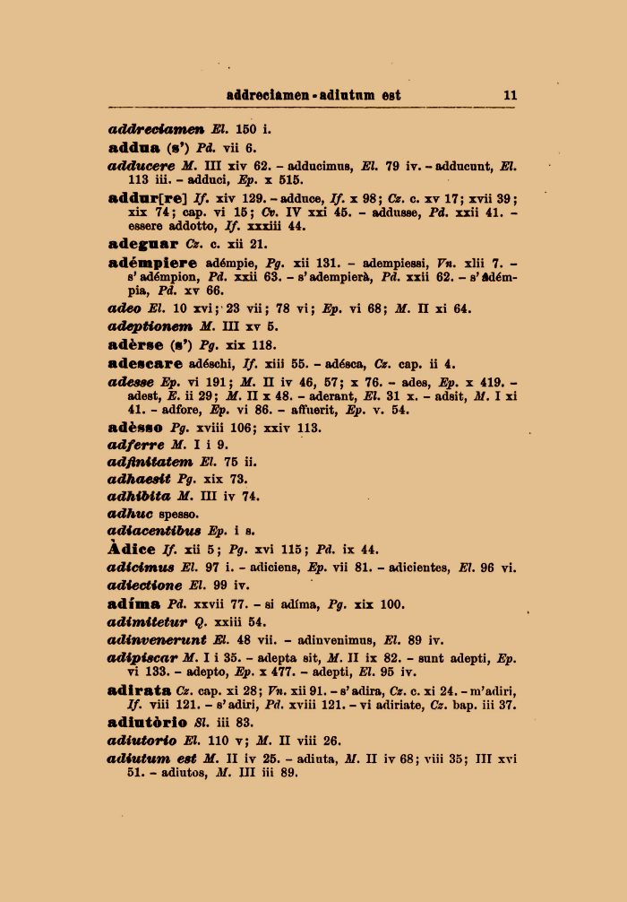 adescare adéschi, If. xiii 55. - adésca, Cz. cap. ii 4. a desse Ep. vi 191 ; M. II iv 46, 57 ; x 76. - ades, Ep. x 419. -adest, E. ii 29 ; M. II x 48. - aderant, El. 31 x. - adsit, AI. I xi 41. - adfore, Ep. vi 86. - affuerit, Ep. v. 54. adèsso Pg. xviii 106; xxiv 113. ad/erre M. I i 9. adfinttatem El. 75 ii. adhaesit Pg. xix 73. adhibita M. Ili iv 74. adhuc spesso. adiacentibws Ep. i s. Àdice If. xii 5; Pg. xvi 115; Pd. ix 44.