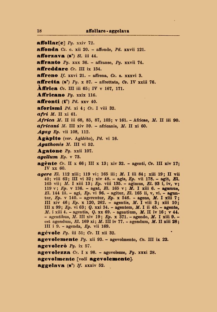 agevolezza Cv. I x 98. - agevolezze, Pg. xxxi 28. agevolmente [vedi agevolemente]. aggelava (s') If. xxxiv 52.