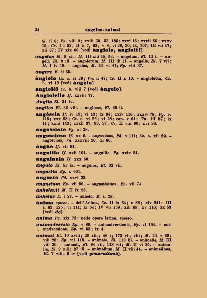 SI. ii 8; Vn. viii 3; xxiii 50, 53, 186; xxvi 16; xxxii 56 ; xxxv 15; Cv. I i 53; II ii 7, 63 ; v 8; vi 28, 30, 44, 107; III vii 47; xii 67; IV xix 66 [vedi àngiola, angiolèl].