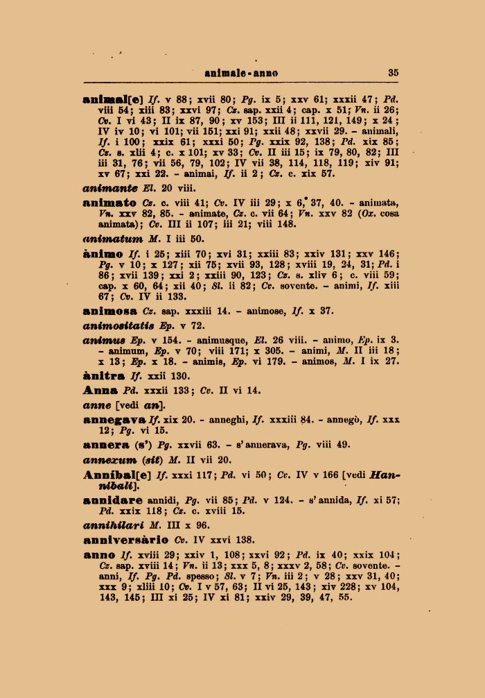 ānimo If. i 25; xiii 70; xvi 31; xxiii 83; xxiv 131; xxv 146; Pg. v 10; x 127; xii 75; xvii 93, 128; xviii 19, 24, 31; Pd. i 86; xvii 139; xxi 2; xxiii 90, 123; Cz. s. xliv 6; c. viii 59; cap. x 60, 64; xii 40; SI. ii 82; Cv. sovente. - animi, If. xiii 67; Cv. IV ii 133. animosa Cz. sap. xxxiii 14. - animose, If. x 37. animoaitatis Ep. v 72.