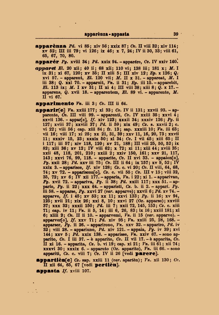 vii 16; viii 17; xi 25; xx 21, 31, 39 ; xxv 11, 16, 20, 73; xxvii 11; xxxiv 15, 23; xxxix 50; xl 34; Cv. I vii 45; xiii 65; II i 117; iii 57; xiv 118, 120; xv 21, 188; ni viii 25, 50, 52; ix 82; xiii 36; xv 12; IV viii 62; x 72; xi 11; xiii 44; xviii 35; xxii 48, 118, 201, 210; xxiii 2; xxiv 150, 161; xxv 21, 117, 143 ; xxvi 76, 99, 118. - apparite, Cv. II xvi 33. - appaion[o], Pg. xxii 28; Pd. xxviii 75; Cv. Ili ii 64; ix!57; xv 9, 52; IV xxix 3. - apparisce, If. xiv 128; Cz. c. vi 20; Cv. II viii, 64, 68, 74 ; xv 72. - appariscono], Cz. c. vii 55 ; Cv. Ili v 15 ; viii 32, 35, 72; xv 6; IV xii 177. - apparta, Vn. i 22; xi 1. -apparivan, Pg. xvii 72. - appariva, Pg. ii 38; Pd. xxiii 117; xxx 51. - apparto, Pg. ii 22 ; xxx 64. - apparisti, Cz. b. ii 2. - appari. Pg. iii 58. - apparse, Pg. xxvi 27 (var. apparve); xxvii 6; Pd. xv 74. -apparve, If. i 45; xv 53; xx 11; xxvi 133; Pg. ii 16; xv 94, 125 ; xvii 21 ; xix 26 ; xxi 8, 10 ; xxvi 27 (Ox. apparso) ; xxviii 37; xxx 32; xxxii 150; Pd. iii 7; xxii 72, 145, 153; Cz. c. xiii 71; cap. iv 11; Vn. ii 5, 14; iii 6, 26, 83; ix 16; xxiii 181; xl 6; xliii 2; Cv. II ii 10. - apparvemi, Vn. ii 15 (var. apparve). -apparvero], If. xxv 71 ; Pd. xiv 95 ; Vn. xxiii 25, 28, 168. -apparser, Pg. ii 26. - apparirono, Vn. xxv 32. - apparirò, Pd. iv 32; viii 28. - apparinno, Pd. xiv 121. - appaia, Pg. iv 39; xvi 144; xxv 5 ; Pd. xxix 138. - apparisse, Vn. xxiv 67. - sono apparito, Cv. I iii 37. - è apparito, Cv. II vii 17. - è apparita, Cv. II xi 16. - apparita, Cz. b. vi 19; cap. xi 21; Vn. iii 61 ; xii 74; xxxvi 30 ; xxxix 6. - apparato (Ox. apparito), Vn. iii 66. - sono appariti, Cz. c. viii 7; Cv. IV ii 26 [vedi parere].