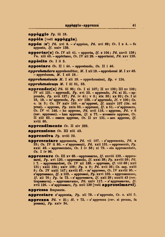 apprestare s'appresta, Pg. xii 79. - s'appresto, Cz. s. xiii 5. apprezza Pd. v 21 ; Sì. v 72. - s' apprezza (far. si prezza, fa prezza), Pg. xxiv 34.