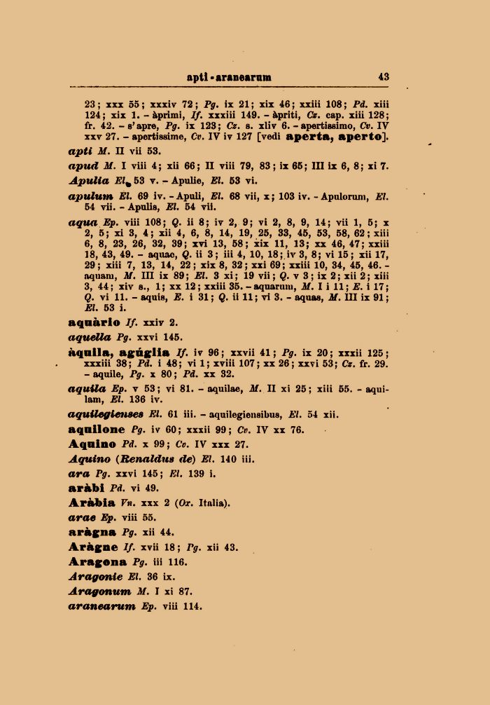 3, 44 ; xiv s., 1 ; xx 12 ; xxiii 35. - aquaruiu, M. I i 11 ; E. i 17 ; Q. vi 11. - aquis, E. i 31 ; Q. ii 11; vi 3. - aquas, M. Ili ix 91 ; El. 53 i.