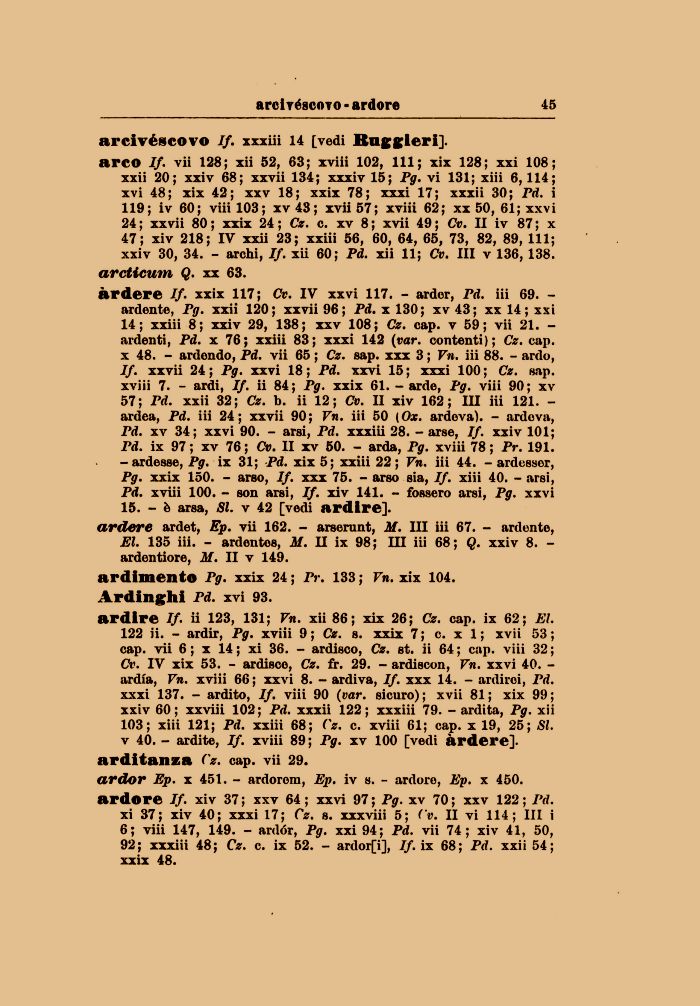 x 48. - ardendo, Pd. vii 65 ; Cz. sap. xxx 3 ; Vn. iii 88. - ardo, If. xxvii 24; Pg. xxvi 18; Pd. xxvi 15; xxxi 100; Cz. sap. xviii 7. - ardi, If. ii 84; Pg. xxix 61. - arde, Pg. viii 90; xv 57; Pd. xxii 32; Cz. b. ii 12; Cv. II xiv 162; III iii 121. -ardea, Pd. iii 24 ; xxvii 90 ; Vn. iii 50 ( Ox. ardeva). - ardeva, Pd. xv 34; xxvi 90. - arsi, Pd. xxxiii 28. - arse, If. xxiv 101; Pd. ix 97 ; xv 76 ; Cv. II xv 50. - arda, Pg. xviii 78 ; Pr. 191. -ardesse, Pg. ix 31; Pd. xix 5; xxiii 22; Vn. iii 44. - ardcsser, Pg. xxix 150. - arso, If. xxx 75. - arso sia, If. xiii 40. - arsi, Pd. xviii 100. - son arsi, If. xiv 141. - fossero arsi, Pg. xxvi 15. - č arsa, SI. v 42 [vedi ardire].