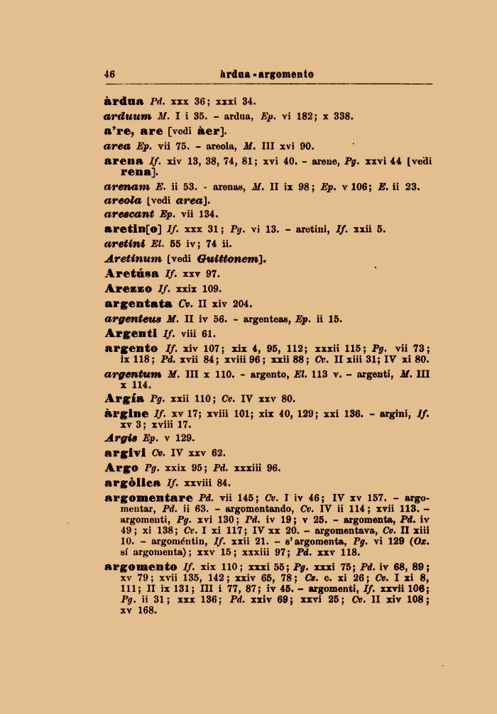 xv 3 ; xviii 17. Argia Ep. v 129. argivi Cv. IV xxv 62. Argo Pg. xxix 95; Pd. xxxiii 96. argòllca If. xxviii 84.
