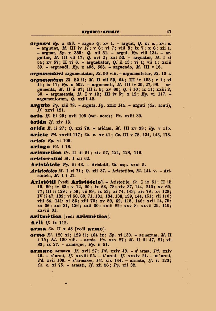 arida E. ii 27; Q. xxi 70. •- aridam, il. III xv 38; Ep. v 115. ariete Pd. xxviii 117; Cz. c. xv 41 ; Cv. Ili v 78, 134, 143, 178. ariete Ep. vi 105. aringo Pd. i 18.