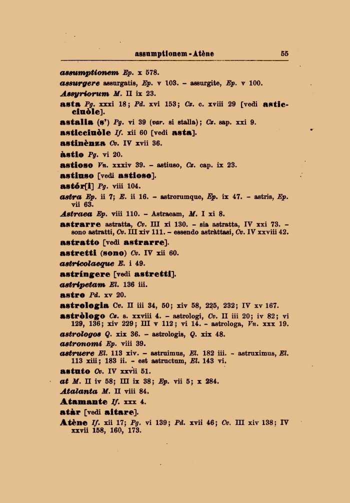astalla (s') Pg. vi 39 (var. si stalla) ; Cz. sap. xxi 9. astlcciuòle If. xii 60 [vedi asta], astinènza Cv. IV xvii 36. àstio Pg. vi 20.