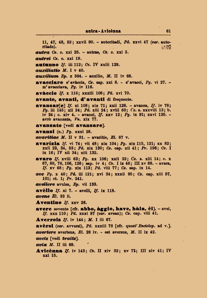 autra Cz. c. xxi 25. - autras, Ci. o. xxi 5. autrei Cz. c. xxi 19. autunno If. iii 112; Cv. IV xxiii 129. auxiliatio M. I v 40.