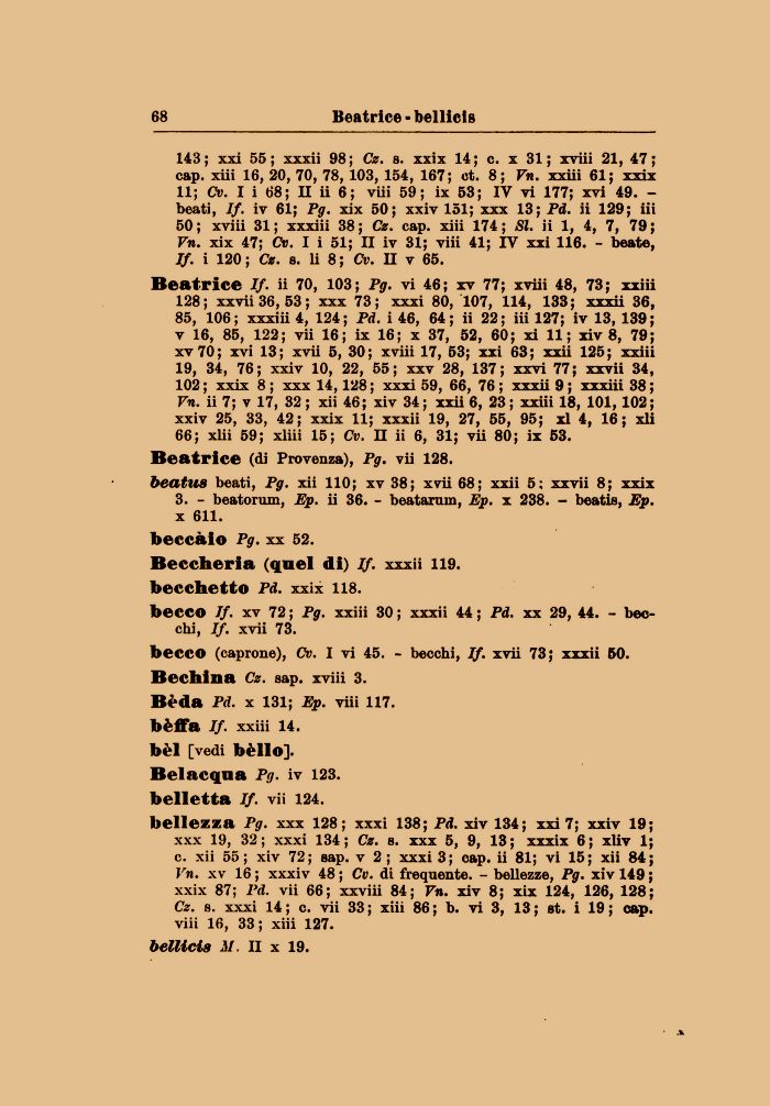 Beatrice If. ii 70, 103; Pg. vi 46; xv 77; xviii 48, 73; xxiii 128; xxvii 36, 53; xxx 73; xxxi 80, 107, 114, 133; mii 36, 85, 106; xxxiii 4, 124; Pd. i 46, 64; ii 22; iii 127; iv 13, 139; v 16, 85, 122; vii 16; ix 16; x 37, 52, 60; xi 11; xiv 8, 79; xv 70 ; xvi 13 ; xvii 5, 30 ; xviii 17, 53; xxi 63 ; xxii 125 ; xxiii 19, 34, 76; xxiv 10, 22, 55; xxv 28, 137; xxvi 77; xxvii 34, 102 ; xxix 8 ; xxx 14,128 ; xxxi 59, 66, 76 ; xxxii 9 ; xxxiii 38 ; Vn. ii 7; v 17, 32; xii 46; xiv 34; xxii 6, 23; xxiii 18, 101, 102; xxiv 25, 33, 42; xxix 11; xxxii 19, 27, 55, 95; xl 4, 16; xii 66; xiii 59; xliii 15; Cv. II ii 6, 31; vii 80; ix 53.
