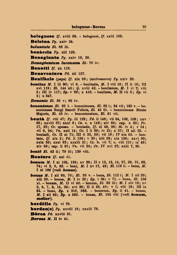 bonum M. I xi 105, 139; xv 28; II v 12, 13, 14, 27, 29, 31, 69, 74; vi 2, 5, 63. - boni, M. I xv 17, 49; El. 116 ii. - bona, M. I xi 106 [vedi bonus], bonus M. I xii 69, 70; El. 93 v. - bona, El. 112 i; M. I xii 20; xiii 20. - bonae, M. I iv 25; Ep. i 38; v 71. - bone, El. 156 xi. - bonam, M. II vi 40. - bonum, El. 93 iii; M. I xiv 18; xv 2, 5, 7, 9, 14, 26; xvi 36; II ii 33, 40; vi; viii 16; in ix 84. - bone, Ep. x 316, 586. - honorum, Ep. ii 41. - bonos, M. I xii 66; Ep. x 563. - bonas, El. 194 viii [vedi bonum, melior]. bordèllo Pg. vi 78. bordon[e] Pg. xxviii 18; xxxiii 78. Bòrea Pd. xxviii 81. Boreas M. n iv 41.