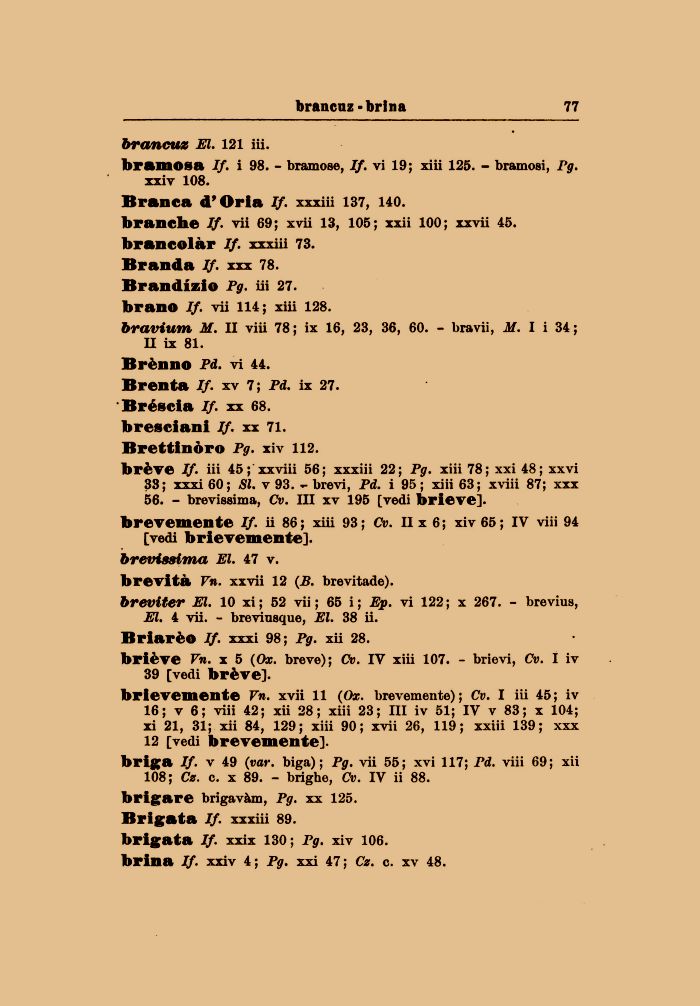 brievemente Vn. xvii 11 (Ox. brevemente); Cv. I iii 45; iv 16; v 6; viii 42; xii 28; xiii 23; III iv 51; IV v 83; x 104; xi 21, 31; xii 84, 129; xiii 90; xvii 26, 119; xxiii 139; xxx