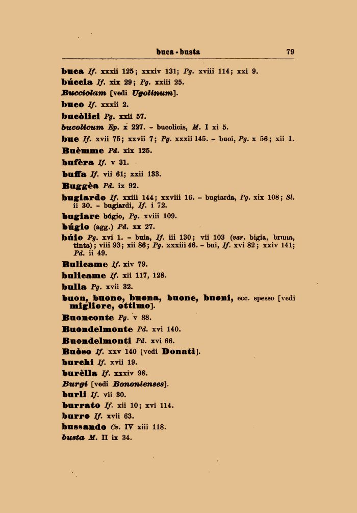 buio Pg. xvi 1. - buia, If. iii 130 ; vii 103 (var. bigia, bruna, tinta) ; viii 93; xii 86; Pg. xxxiii 46. - bni, If. xvi 82 ; xxiv 141; Pd. ii 49.