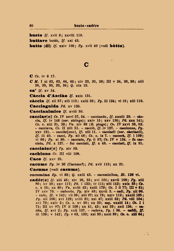 cadér[e] If. xiii 45; xiv 28, 33; xvi 101; xxvii 109; Pg. xiii 80; xv 20; xxv 117; Pd. i 133; iv 111; xiii 142; xxix 55; C». c. x 25; xx 80; Vn. xviii 43; xxiii 179 ; Cv. I ii 77; UE v 81; IV xxv 70. - cadendo, Pg. xiv 49; xxvii 3. - cadi, Pg. xii 96.