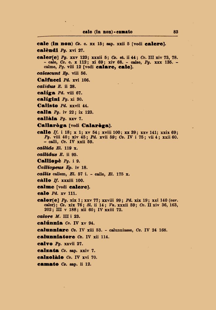 callis callem, El. 57 i. - calle, El. 175 x. callo lf. xxxiii 100. calme [vedi calere], calo Pd. xv 111.