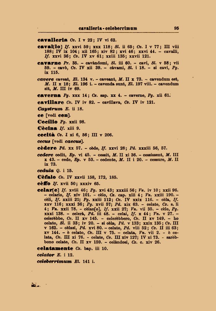 celar[e] If. xviii 46; Pg. xvi 43; xxxiii 56; Vn. iv 10; xxii 96. - celarlo, If. xiv 101. - cèlo, Cz. cap. xiii 4 ; Vn. xxiii 190. -cèli, If. xxiii 21; Pg. xxiii 112; Cv. IV xxix 116. - cèla, If. xxv 116; xxxi 36; Pg. xvii 57; Pd. xix 63. - colate, Cz. s. li 4; Vn. xxii 78. - cèlan[o], lf. xxii 27; Vn. vii 35. - cèle, Pg. xxxi 138. - celerà, Pd. iii 48. - celai, If. x 44; Vn. v 27. -celerèbbe, Cv. II xv 145. - celerèbbero, Cv. II xv 149. - lio celato, SI. ii 33; iv 20. - si cèla, Pd. v 133; xxix 135; Cv. Ili v 162. - cèlasi, Pd. xvi 80. - celato, Pd. viii 52; Cv. II iii 63; xv 144. - è celato, Cv. Ili v 75. - celata, Vn. vii 2. - è celata, Cv. IH xi 76. - celate, Cv. ni xiv 127; IV xi 73. - sarèb-bono celate, Cv. II xv 159. - celàndosi, Cz. c. xiv 26.