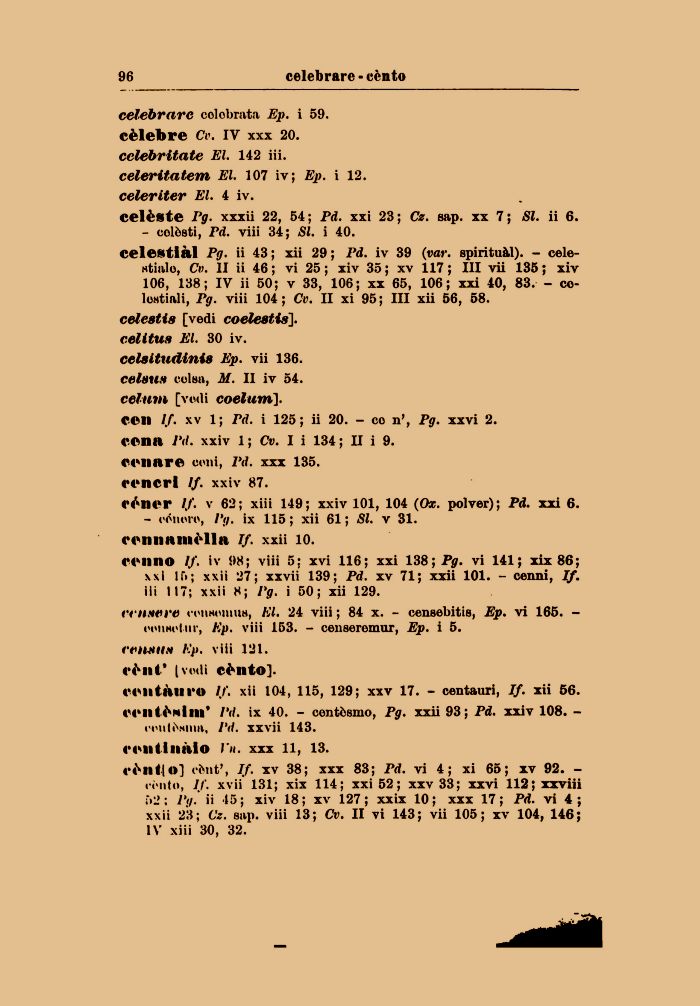 cenno lf. iv 98; viii 5; xvi 116; xxi 138 ; Pg. vi 141; xix 86; x\ 1 15; xxii 27; xxvii 139; Pd. xv 71; xxii 101. - ceani, If. ili 117; xxii 8; I'g. i 50; xii 129.