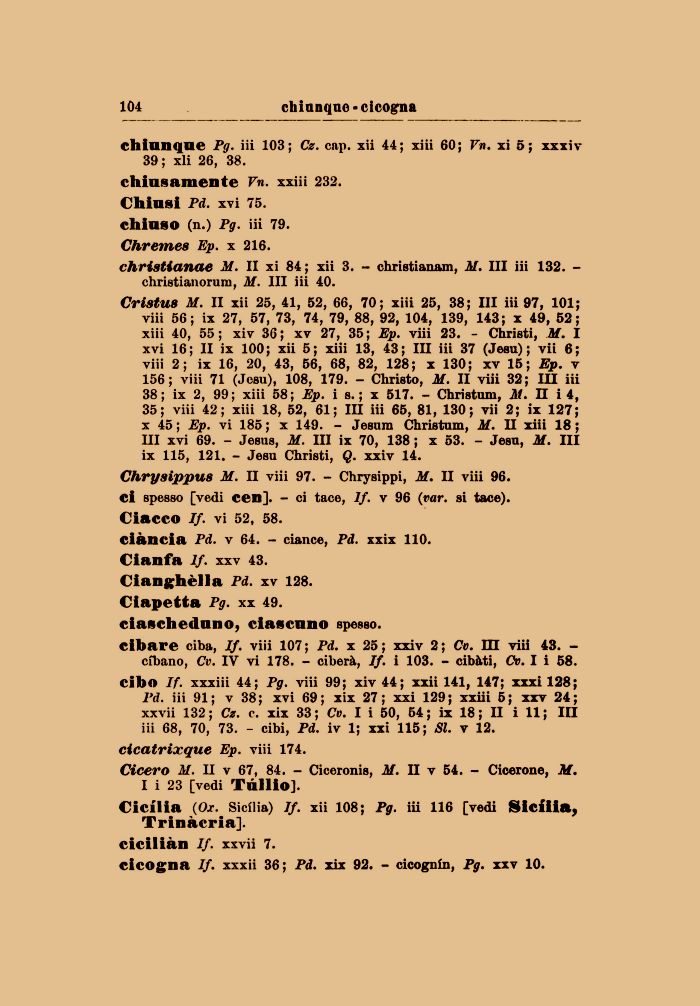 Chryaippws M. n viii 97. - Chrysippi, M. II viii 96. ci spesso [vedi cen]. - ci tace, If. v 96 (var. si tace). Ciacco If. vi 52, 58.