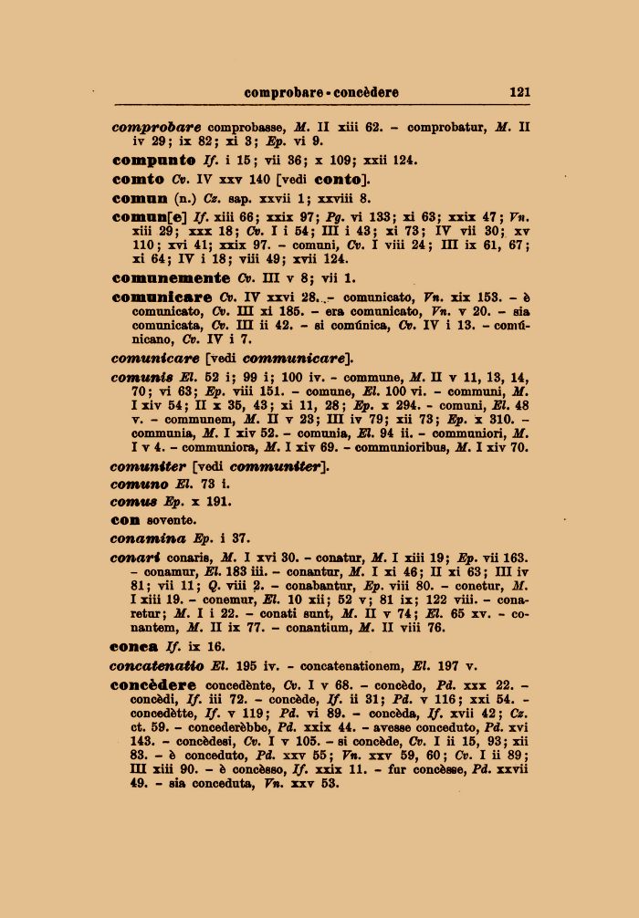 comunicare Cv. IV xxvi 28...- comunicato, Vn. xix 153. - è comunicato, Cv. HI xi 185. - era comunicato, Vn. v 20. - sia comunicata, Cv. IH ii 42. - si comtinica, Cv. IV i 13. - comti-nieano, Cv. IV i 7.